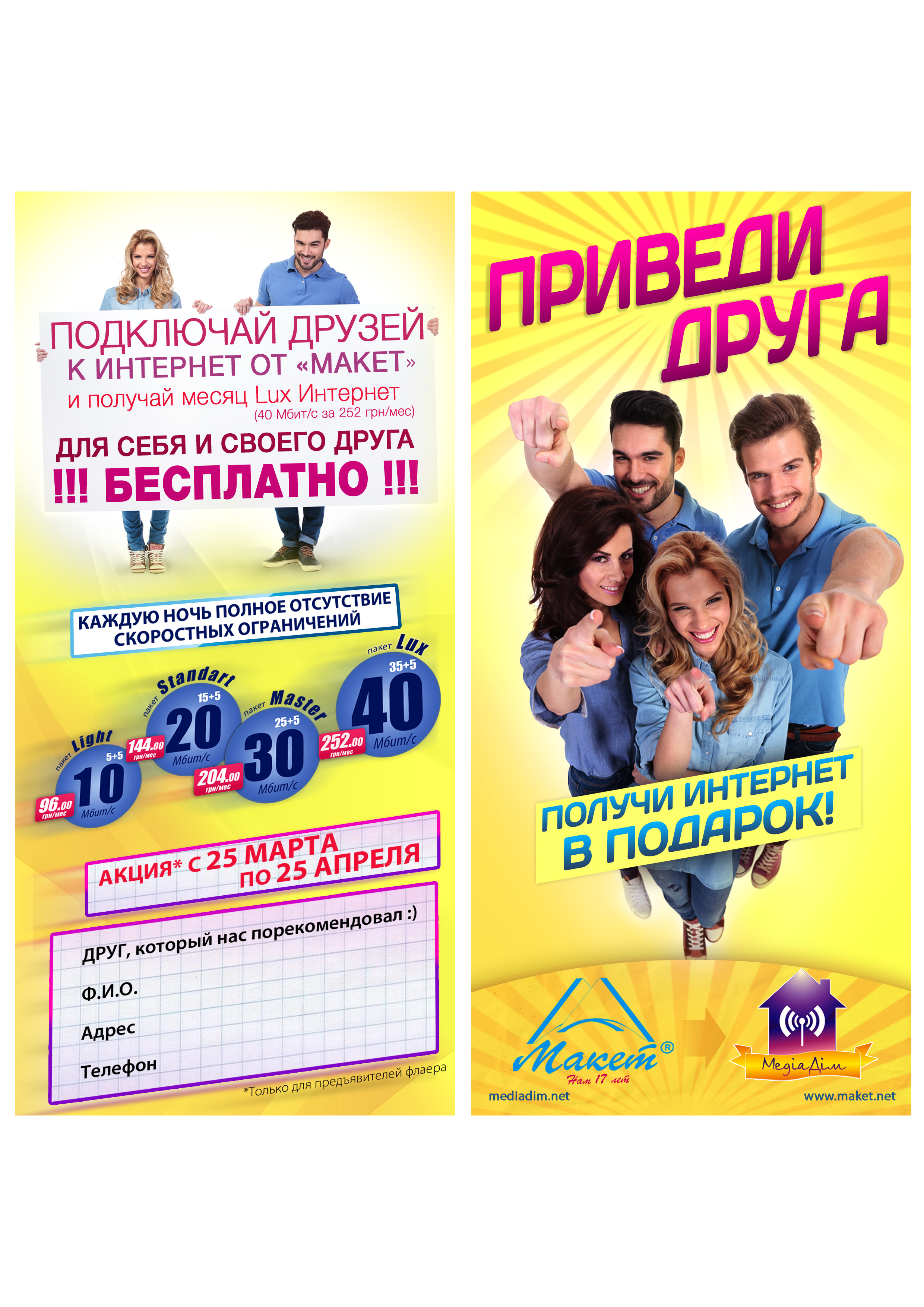 Порекомендуйте другу или знакомому подключение услуг Интернет от компании «Макет». При заключении договора по вашей рекомендации в период с 25 марта по 25 апреля 2014 г., получите каждый 1 месяц бесплатного пользования пакетом Интернет «Lux» (скорость 40 Мбит/с, обычная стоимость — 252 грн./мес.)