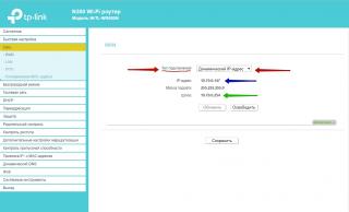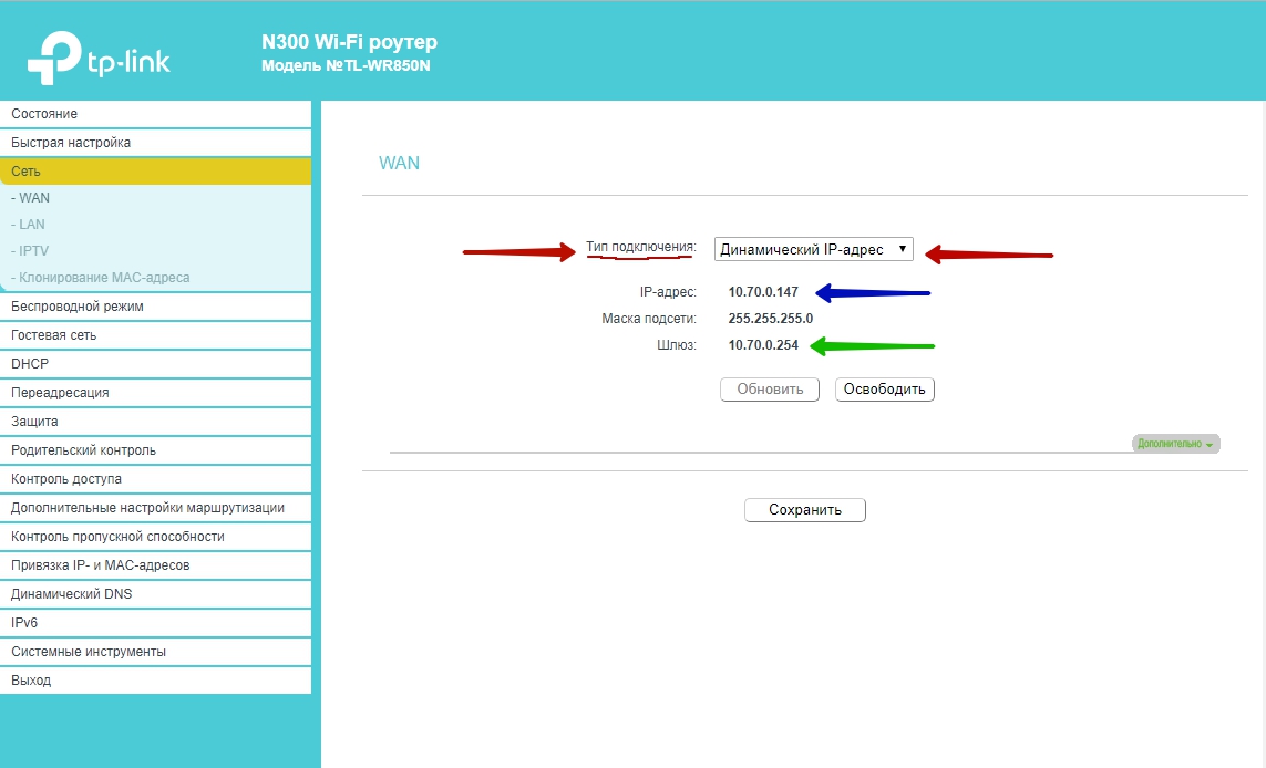 Теперь, чтобы подключится к сети компании «Медиадом», вам необходимо указать в настройках вашего Wi-Fi роутера, в разделе сеть - WAN - тип подключения - Динамический IP. Пока для автоматического подключения доступен один IP-адрес. Для подключения других сетевых устройств, не через роутер, а к примеру через простой коммутатор, нужно позвонить в службу техподдержки (2-08-73) с просьбой добавить в ваш пул DHCP дополнительный адрес. Но в скором времени, появится опция "добавить устройство" в личном кабинете. Сейчас работают оба типа подключения, как PPTP, так и DHCP. Скрин показывает, как выглядит настройка для WAN порта динамического IP WiFi роутера TP-Link (красными стрелками - где нужно изменить, синяя и зелёная - ваш IP и шлюз, который Вы автоматически получите.)